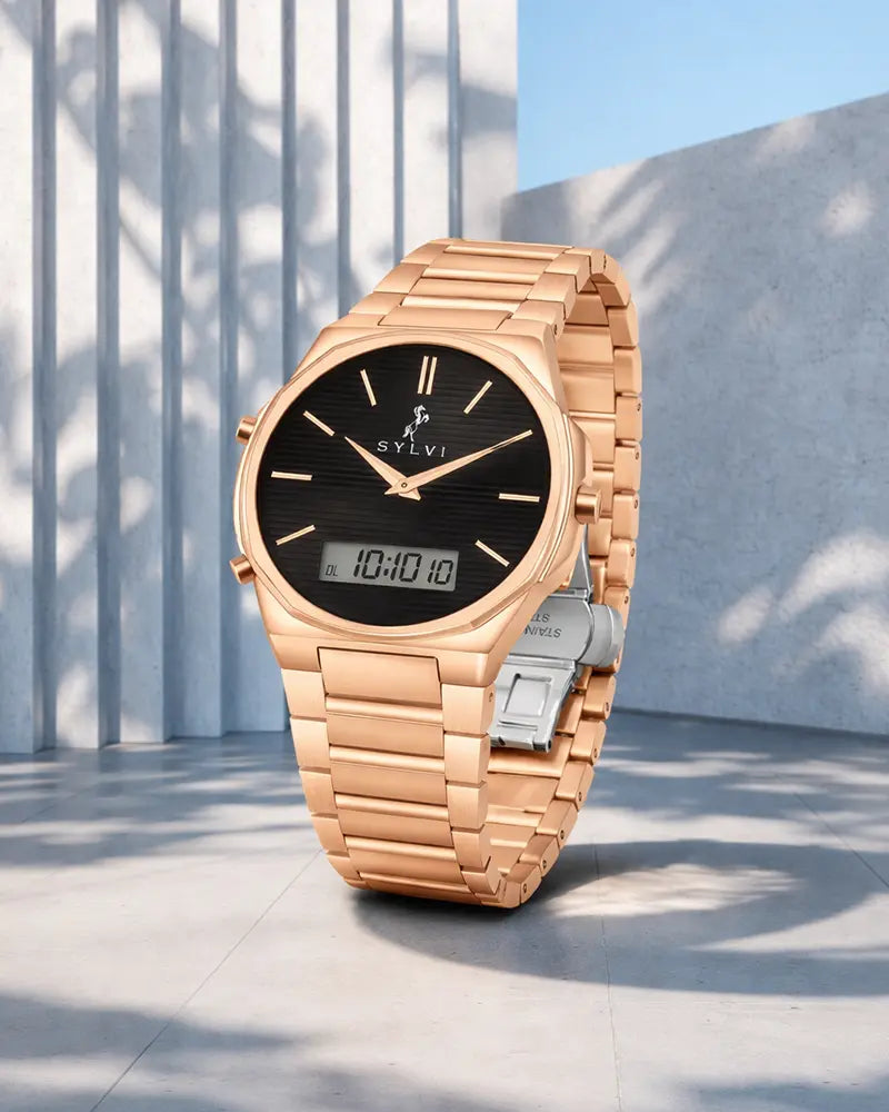 Both durability and style are increased by the Stainless steel Strap. It fits safely on the forearm even as it fits comfortably throughout the day. The smooth finished case is a perfect match to the glossy finish and it all looksributes to a coherent and high-end model.