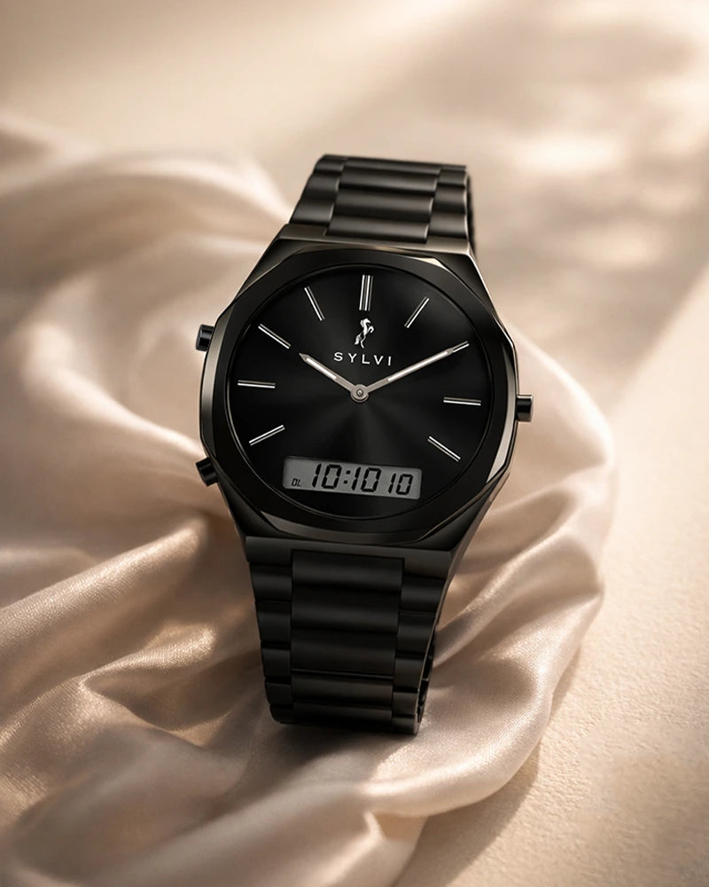 The all-black case delivers a strong and structured look, designed to help one create a confident appearance on the wrist. Its clean form adds depth and character, offering a modern alternative to traditional designs.