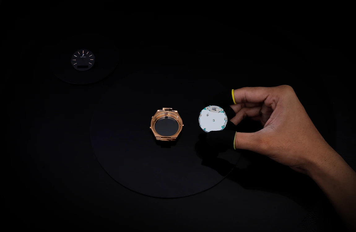 The rose gold case introduces a warm, elevated persona that adds to the overall image of this timepiece. Its angular, sculpted shape provides depth and confidence, offering a fresh perspective beyond conventional watch designs.