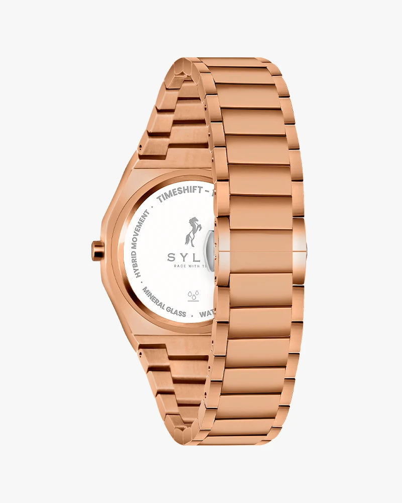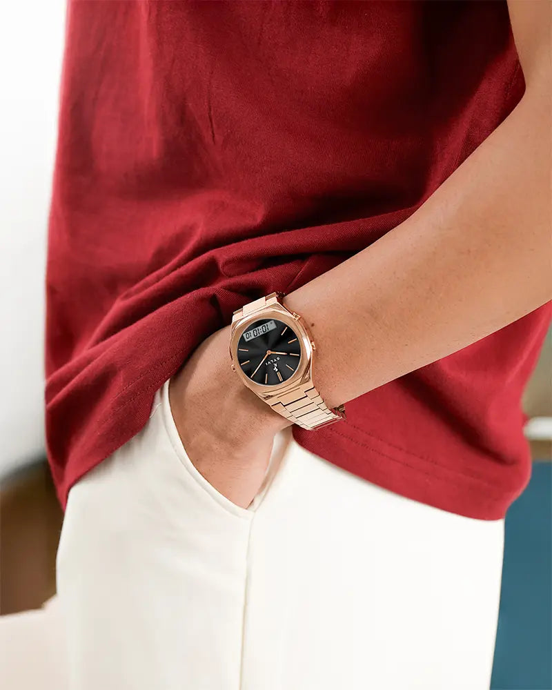 The TimeShift Black Rose Gold Steel is a daring dual time watch designed for individuals who appreciate refined detailing, modern aesthetics, and purposeful functionality. The black dial and the rose gold steel body form a visual contrast that is so rich and it is the presence that defines presence in the changing world of watches today.