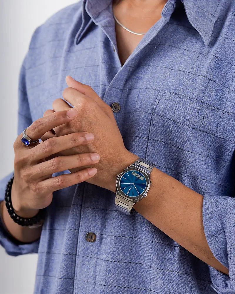 TimeShift Blue Silver Steel is a sophisticated dual time watch designed to fit people who appreciate accuracy, definition and elegant or professional style of life. The stunningly blue dial with a silver steel body makes it a confident presence on the wrist and quite contemporary and timeless.