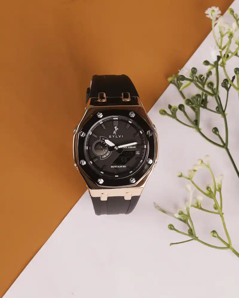 Introducing the Sylvi Rosegold Dial Black Silicone Strap Watch for Men, a sleek and sophisticated timepiece that is perfect for the modern man. The striking contrast between the rose gold dial and the black silicone strap gives the watch a bold and contemporary look that will elevate any outfit.