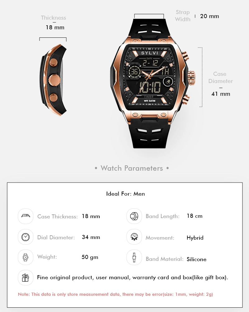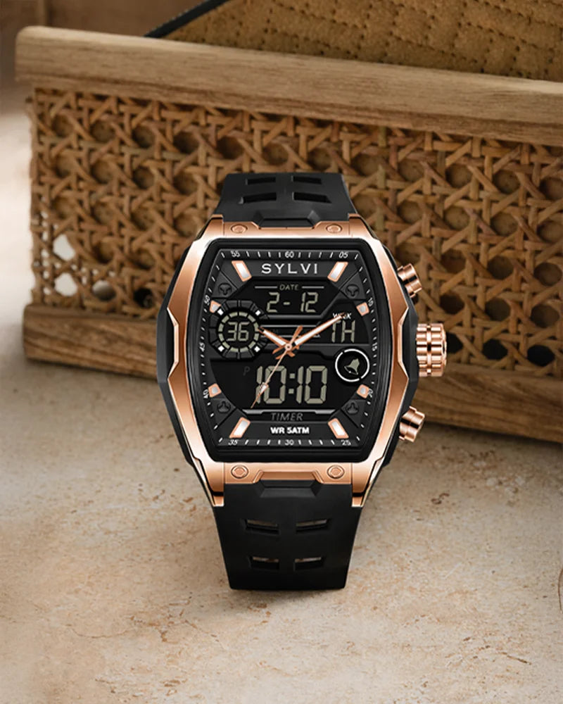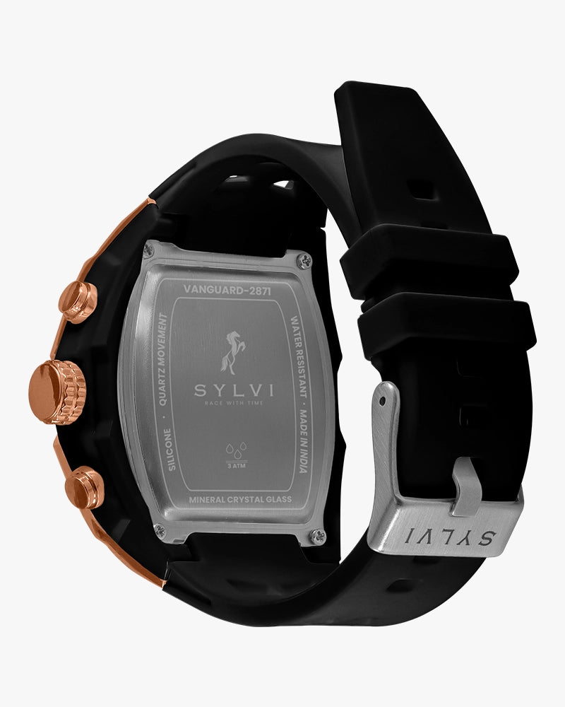 The Vanguard Black Rose Gold analog-digital watch is a watch that is crafted based on the requirements of men who treasure readability, functionality, and a bold contemporary look. The bold touches of rose gold case, black dial, and Black Silicone straps give a powerful and classy appearance that is noticeable on the wrist.