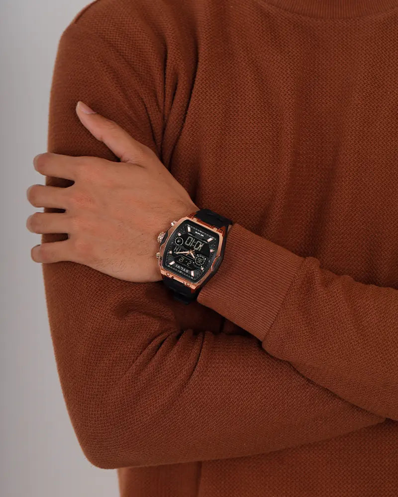 Vanguard Black Rose Gold Analog-Digital watch is a strong, accurate, and confident timepiece and an assuring ally in everyday life.