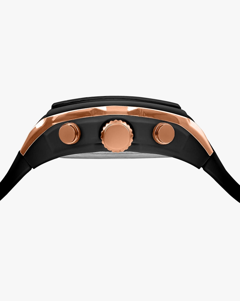 The bold touches of rose gold case, black dial, and black silicone straps give a powerful and classy appearance that is noticeable on the wrist.
