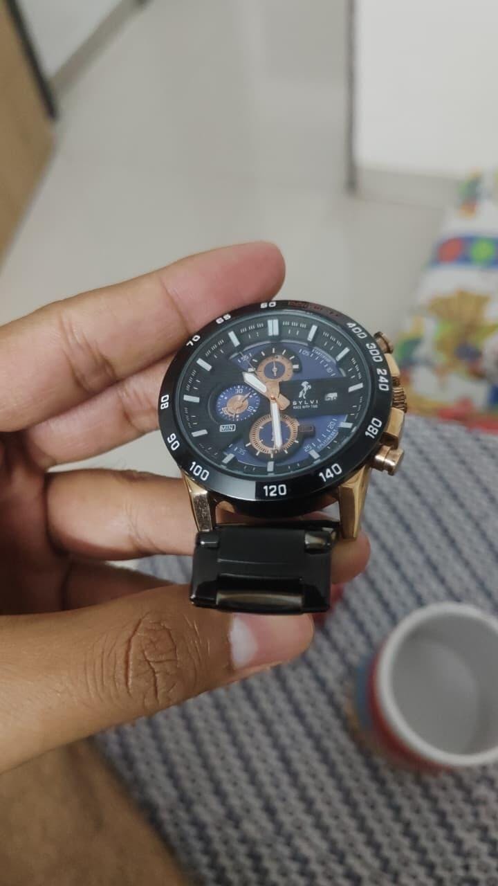 Introducing the Sylvi Timegrapher Rosegold Accent Chronograph Watch—a harmonious fusion of contemporary design and meticulous craftsmanship, tailored for the discerning gentleman.