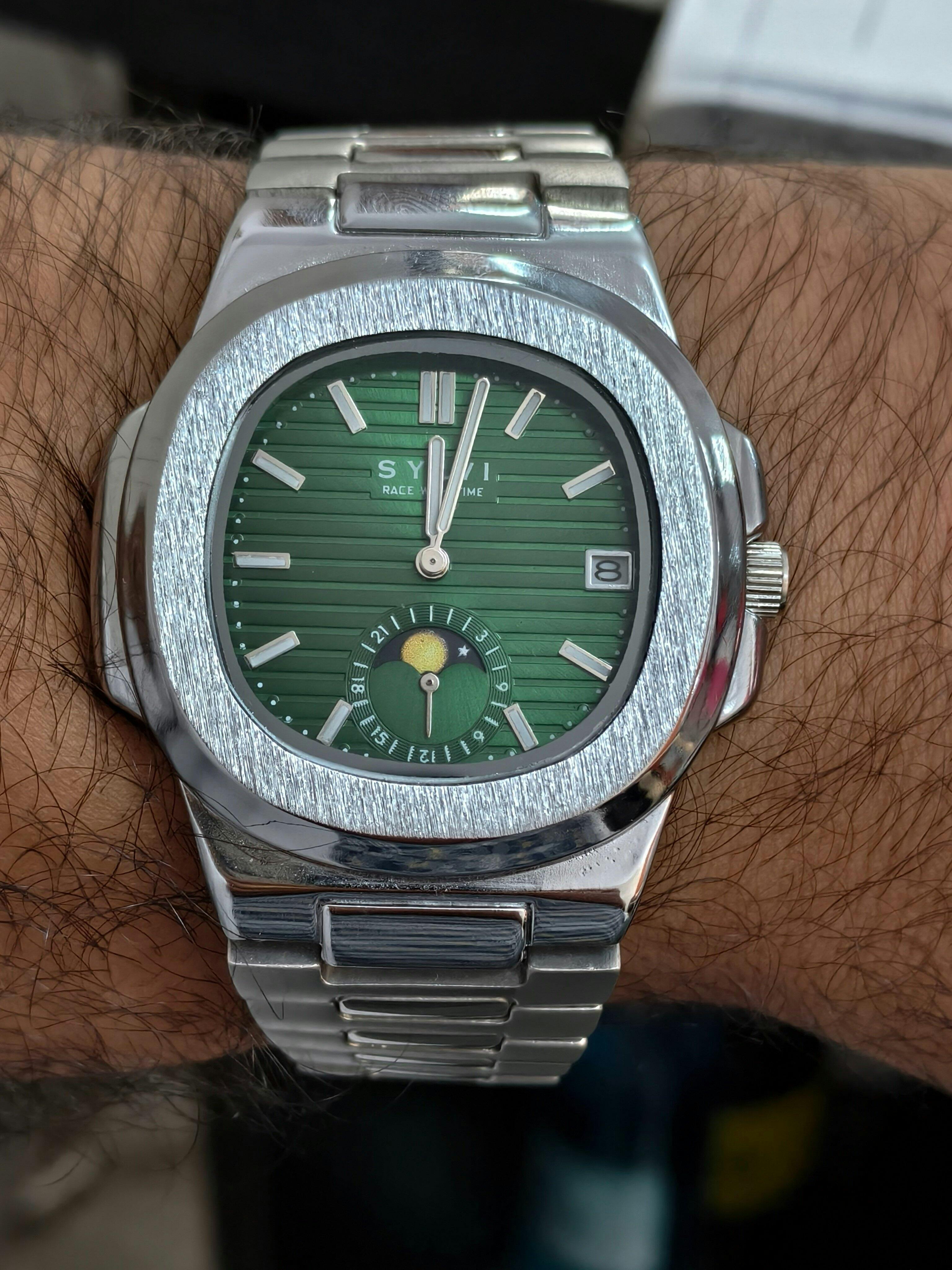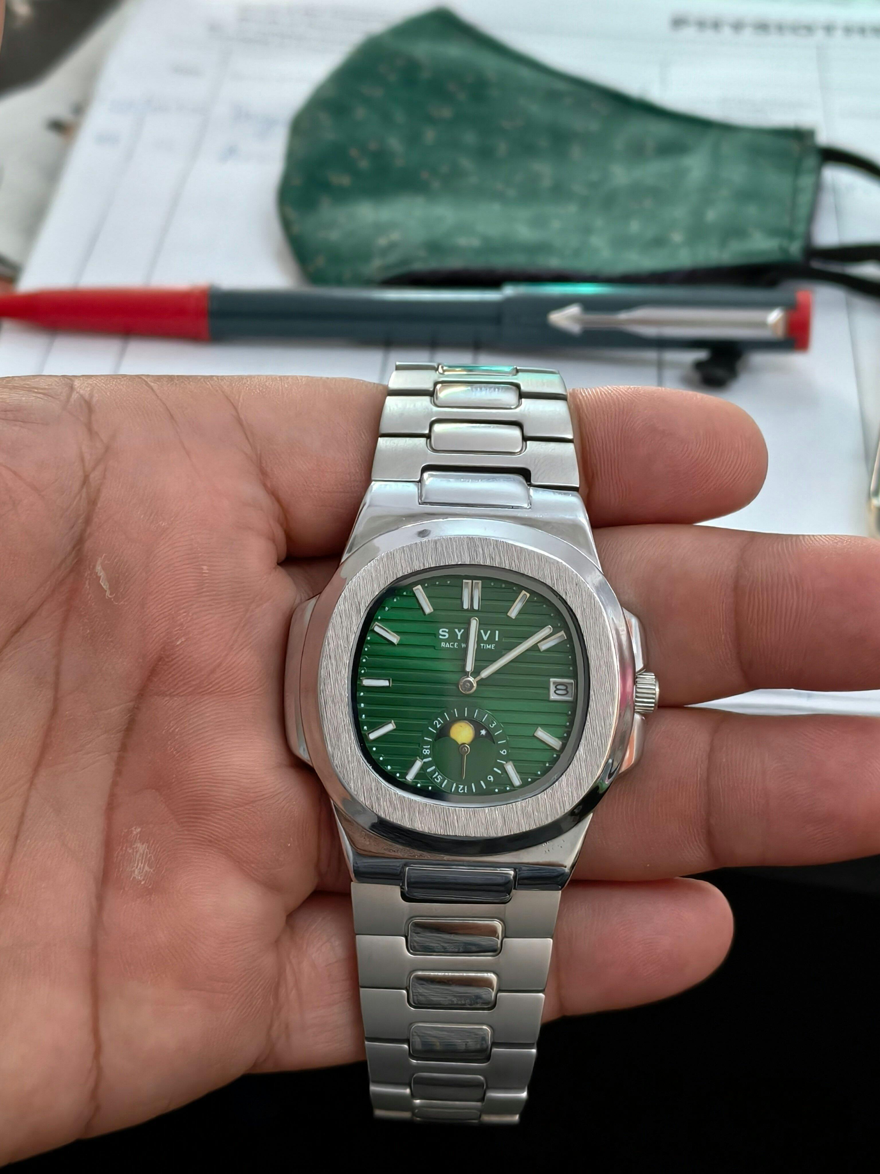 Refined and bold, the Sylvi Urbane Moon Green Silver blends modern elegance with celestial inspiration. Its distinctive squircle-shaped analog dial, inspired by the moon, features a deep green hue contrasted with sleek silver details. The unique design adds a sophisticated touch, while the date display ensures you stay organized without compromising style.
